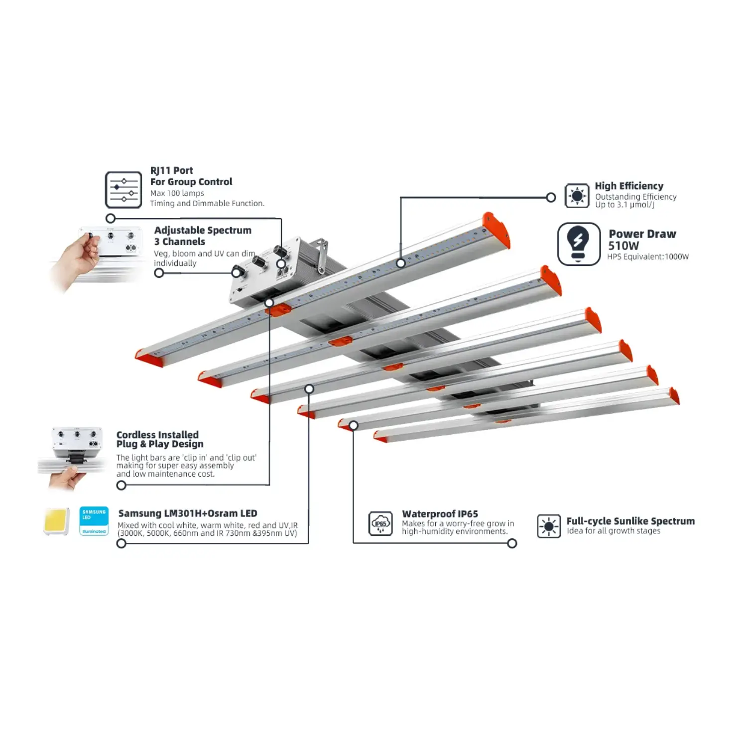 | Light Spectrum | Warm 3000k + white 5000K + red 660nm + UV 395nm + far red 730nm |