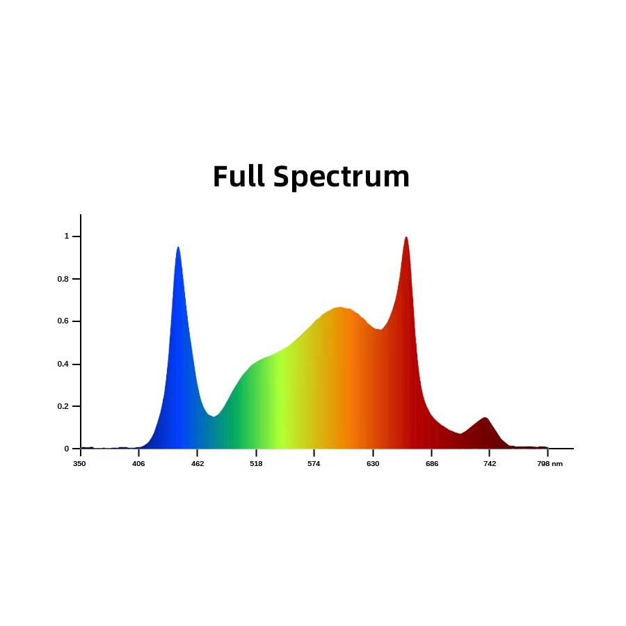 - Spectrum warm wit 3000K, koel wit 6500K, rood 660 nm, blauw 460 nm, verrood 730 nm