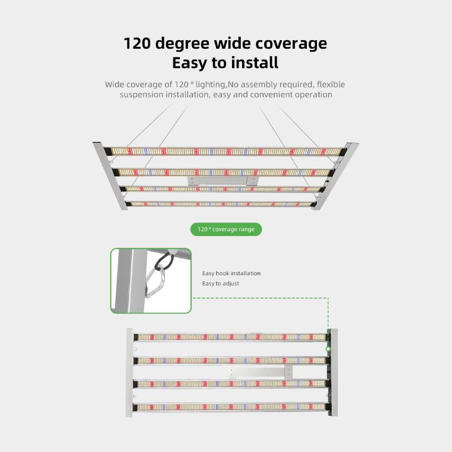Het elegante ontwerp combineert een moderne uitstraling met praktische functionaliteit. Het duurzame aluminium frame en het geïntegreerde koellichaam zorgen voor uitstekende warmteafvoer, wat de prestaties en levensduur van de LED’s optimaliseert en tegelijkertijd de temperatuur in je kweekruimte stabiel houdt.